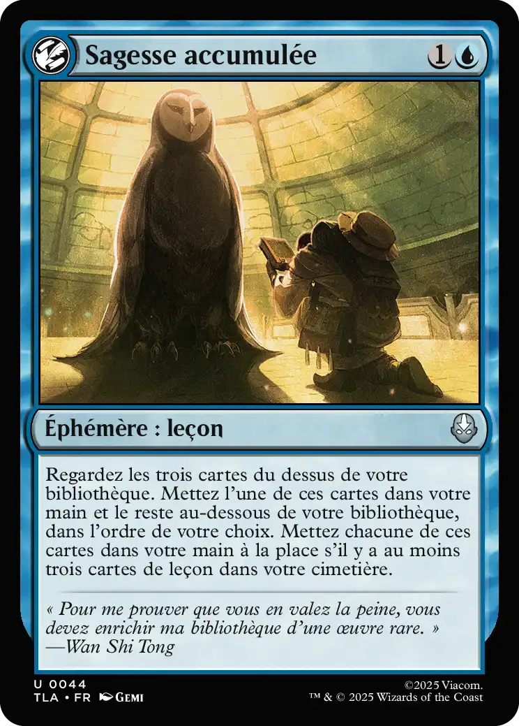 Regardez les trois cartes du dessus de votre bibliothèque. Mettez l'une de ces cartes dans votre main et le reste au-dessous de votre bibliothèque, dans l'ordre de votre choix. Mettez chacune de ces cartes dans votre main à la place s'il y a au moins trois cartes de leçon dans votre cimetière.