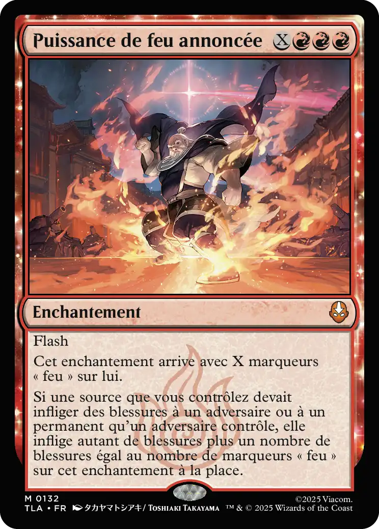 Si une source que vous contrôlez devait infliger des blessures à un adversaire ou à un permanent qu'un adversaire contrôle, elle inflige autant de blessures plus un nombre de blessures égal au nombre de marqueurs "feu" sur cet enchantement à la place.