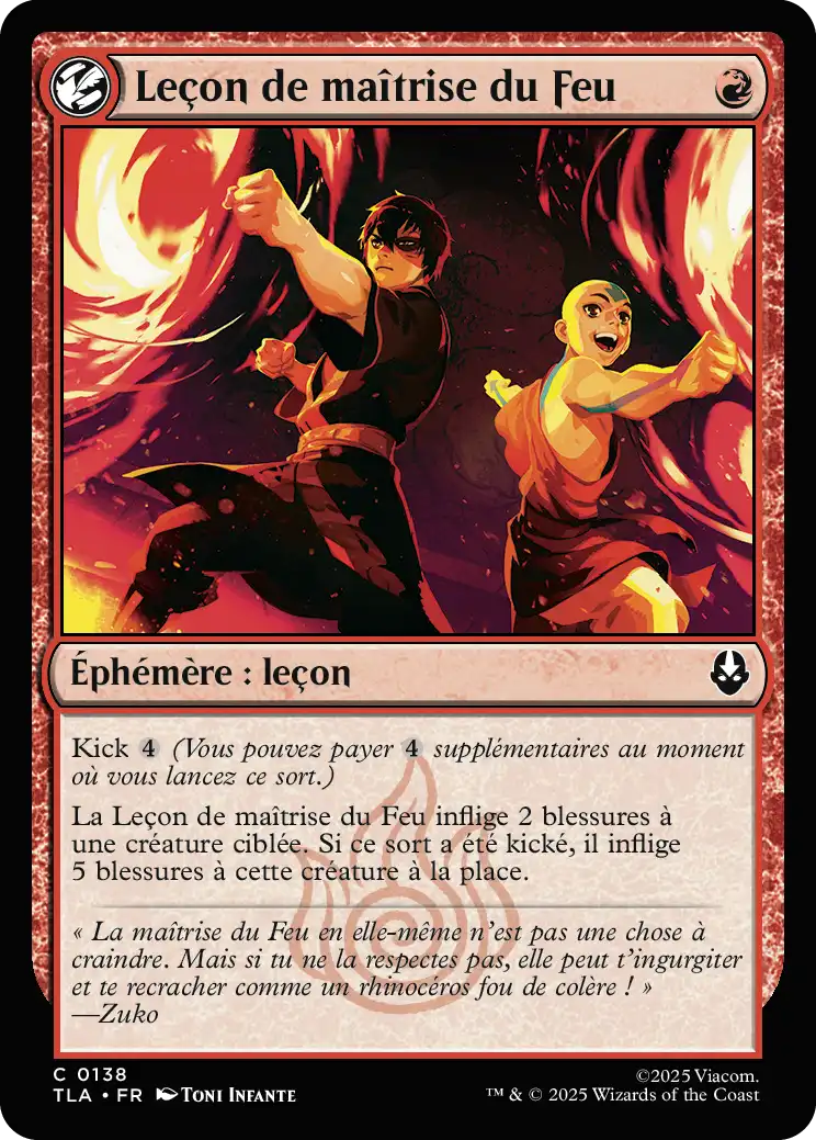 La Leçon de maîtrise du Feu inflige 2 blessures à une créature ciblée. Si ce sort a été kické, il inflige 5 blessures à cette créature à la place.