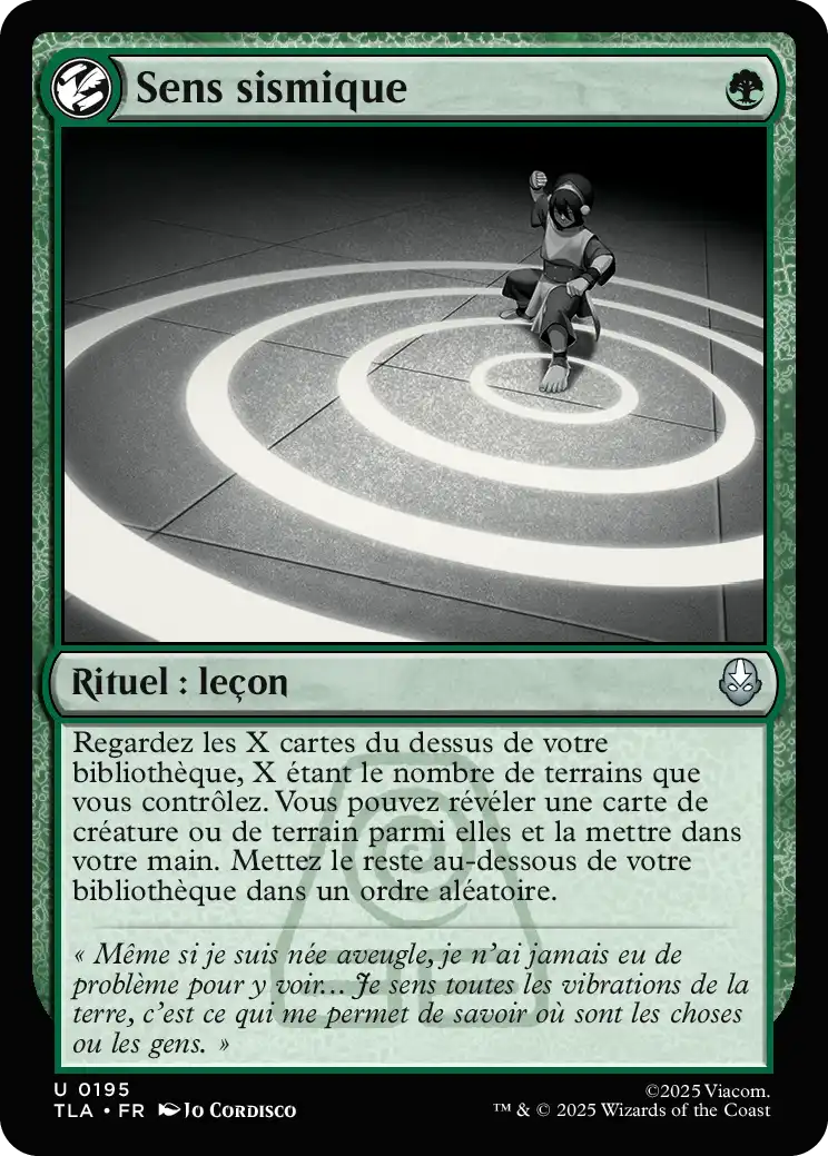 Regardez les X cartes du dessus de votre bibliothèque, X étant le nombre de terrains que vous contrôlez. Vous pouvez révéler une carte de créature ou de terrain parmi elles et la mettre dans votre main. Mettez le reste au-dessous de votre bibliothèque dans un ordre aléatoire.