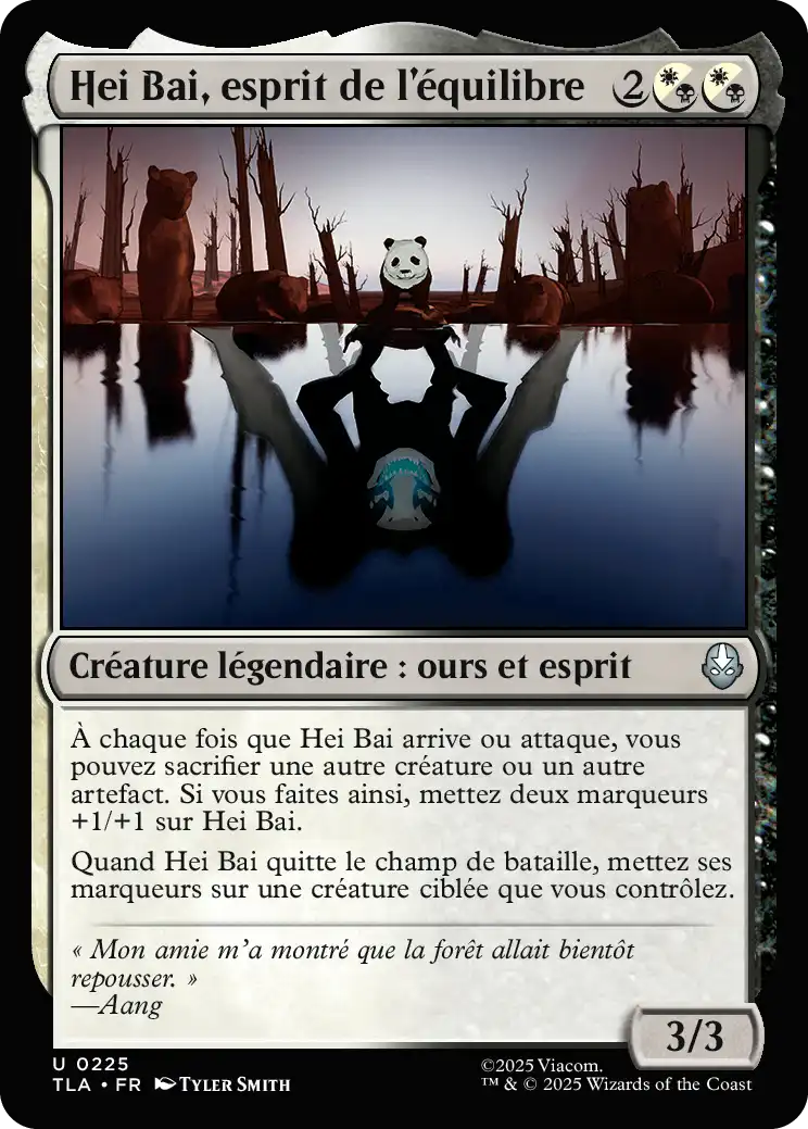À chaque fois que Hei Bai arrive ou attaque, vous pouvez sacrifier une autre créature ou un autre artefact. Si vous faites ainsi, mettez deux marqueurs +1/+1 sur Hei Bai.