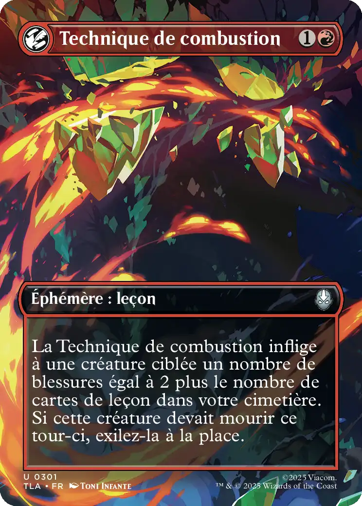 La Technique de combustion inflige à une créature ciblée un nombre de blessures égal à 2 plus le nombre de cartes de leçon dans votre cimetière. Si cette créature devait mourir ce tour-ci, exilez-la à la place.