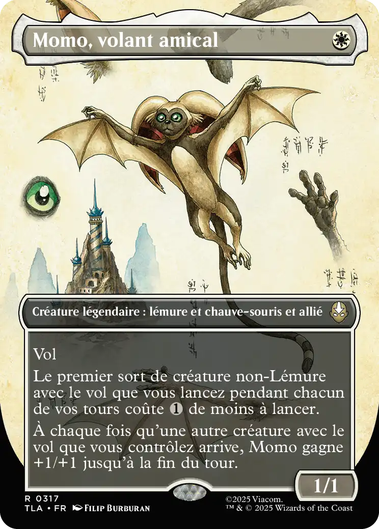 À chaque fois qu'une autre créature avec le vol que vous contrôlez arrive, Momo gagne +1/+1 jusqu'à la fin du tour.