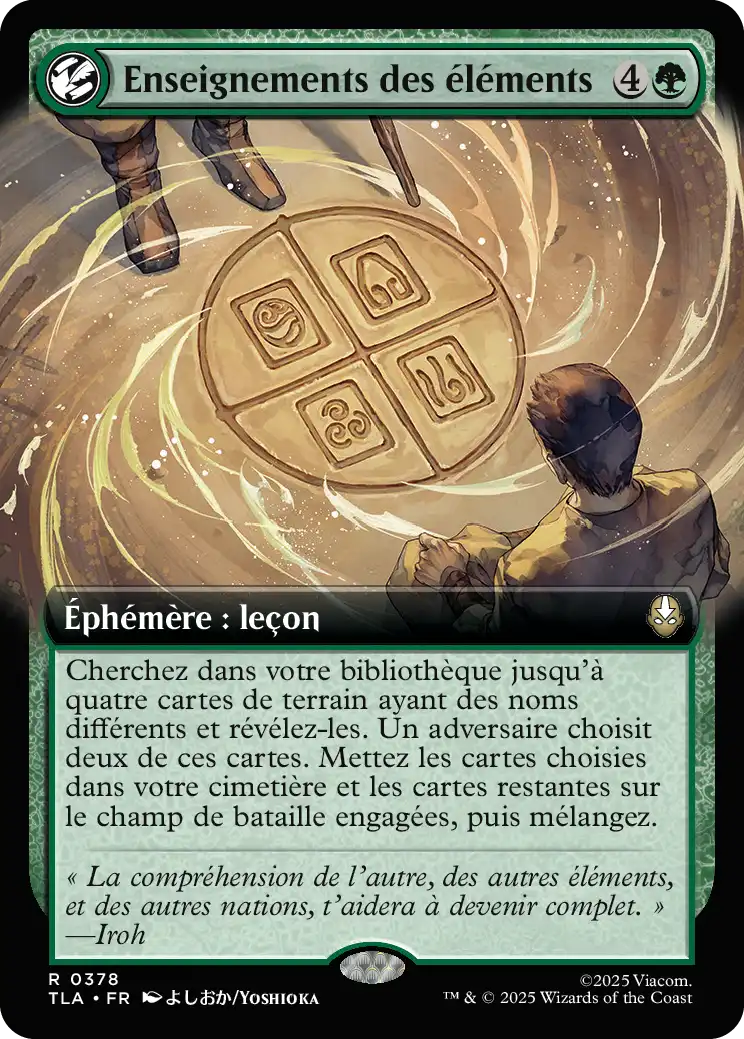 Cherchez dans votre bibliothèque jusqu'à quatre cartes de terrain ayant des noms différents et révélez-les. Un adversaire choisit deux de ces cartes. Mettez les cartes choisies dans votre cimetière et les cartes restantes sur le champ de bataille engagées, puis mélangez.