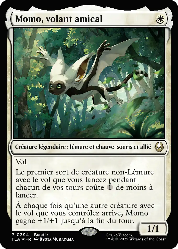 À chaque fois qu'une autre créature avec le vol que vous contrôlez arrive, Momo gagne +1/+1 jusqu'à la fin du tour.