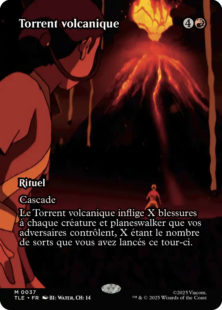 Le Torrent volcanique inflige X blessures à chaque créature et planeswalker que vos adversaires contrôlent, X étant le nombre de sorts que vous avez lancés ce tour-ci.