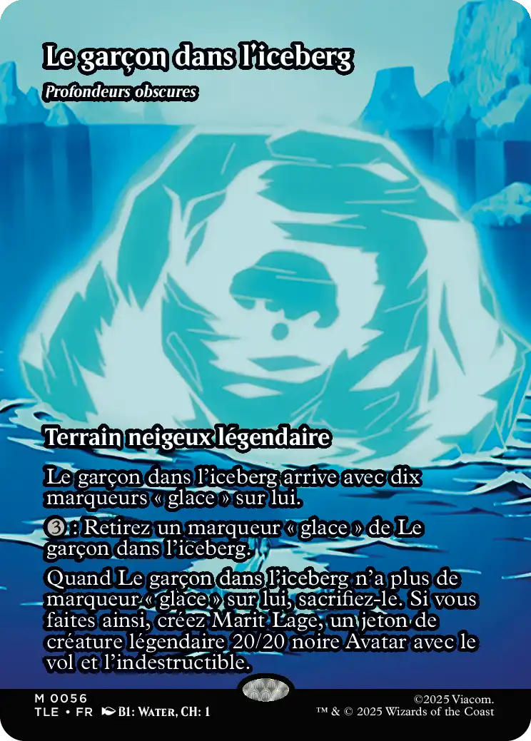 Quand Le garçon dans l'iceberg n'a plus de marqueur "glace" sur lui, sacrifiez-le. Si vous faites ainsi, créez Marit Lage, un jeton de créature légendaire 20/20 noire Avatar avec le vol et l'indestructible.
