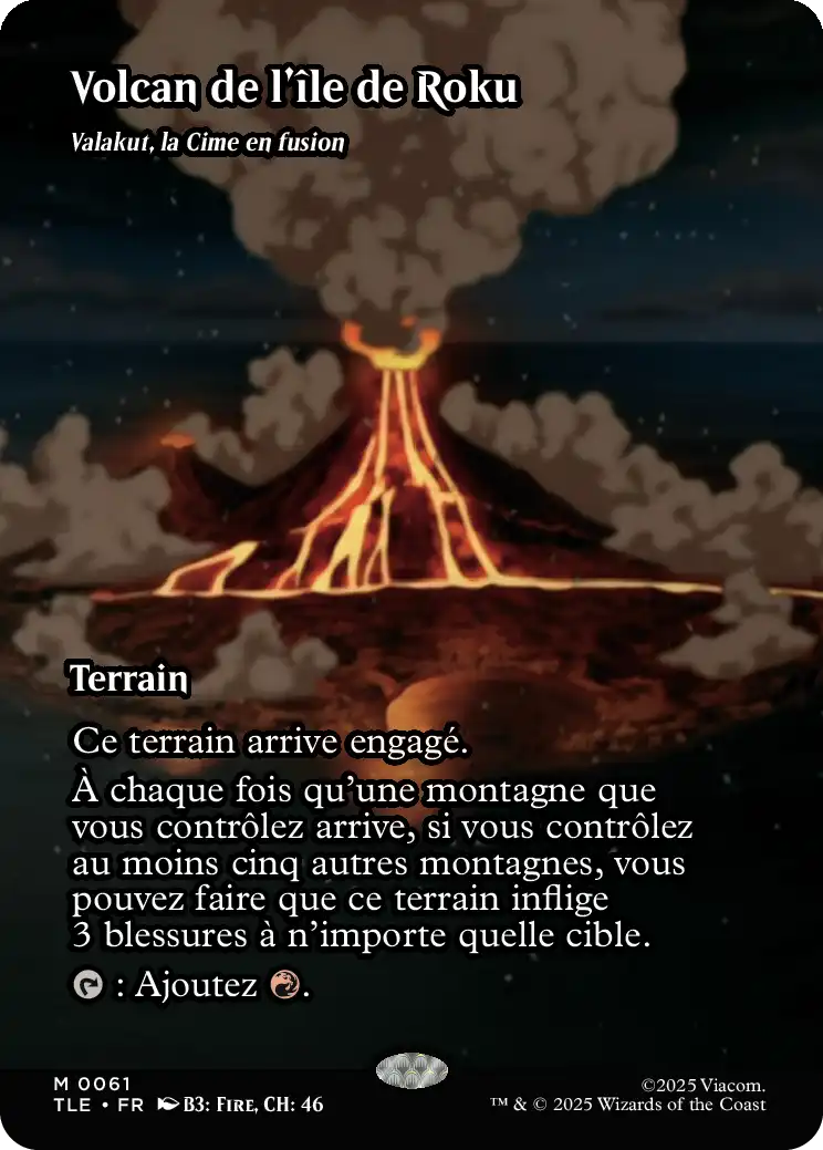 À chaque fois qu'une montagne que vous contrôlez arrive, si vous contrôlez au moins cinq autres montagnes, vous pouvez faire que ce terrain inflige 3 blessures à n'importe quelle cible.