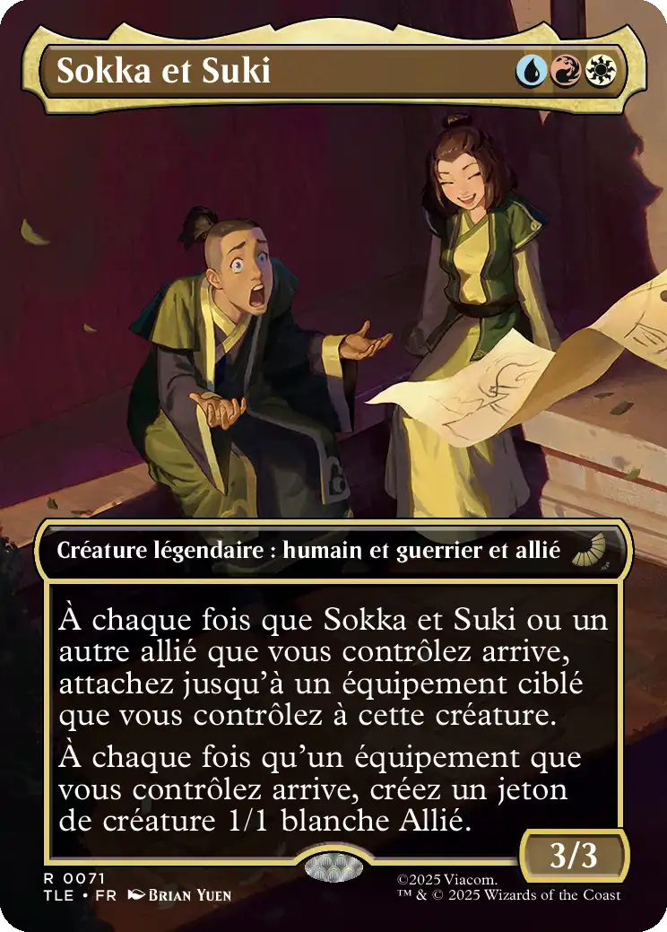 À chaque fois que Sokka et Suki ou un autre allié que vous contrôlez arrive, attachez jusqu'à un équipement ciblé que vous contrôlez à cette créature.