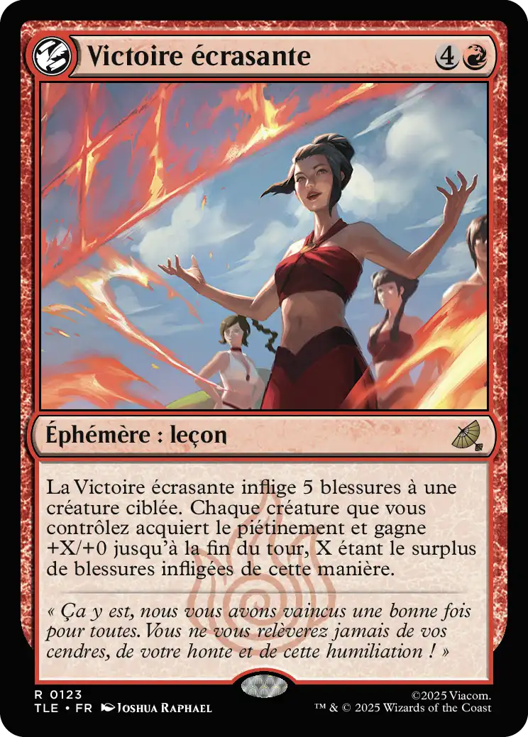 La Victoire écrasante inflige 5 blessures à une créature ciblée. Chaque créature que vous contrôlez acquiert le piétinement et gagne +X/+0 jusqu'à la fin du tour, X étant le surplus de blessures infligées de cette manière.