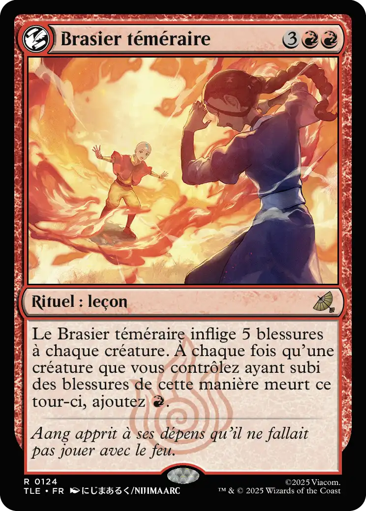 Le Brasier téméraire inflige 5 blessures à chaque créature. À chaque fois qu'une créature que vous contrôlez ayant subi des blessures de cette manière meurt ce tour-ci, ajoutez .