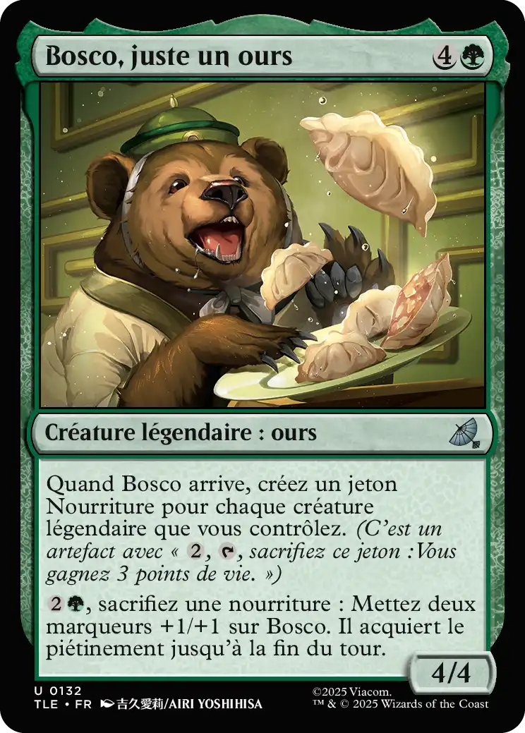 , sacrifiez une nourriture : Mettez deux marqueurs +1/+1 sur Bosco. Il acquiert piétinement jusqu'à la fin du tour.