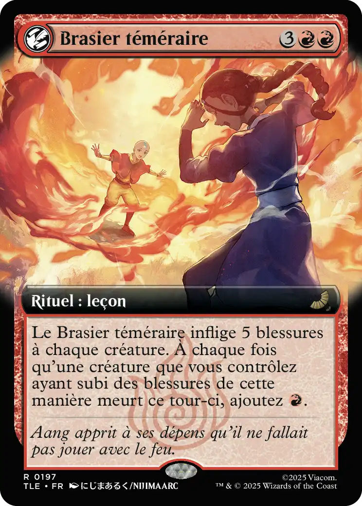 Le Brasier téméraire inflige 5 blessures à chaque créature. À chaque fois qu'une créature que vous contrôlez ayant subi des blessures de cette manière meurt ce tour-ci, ajoutez .