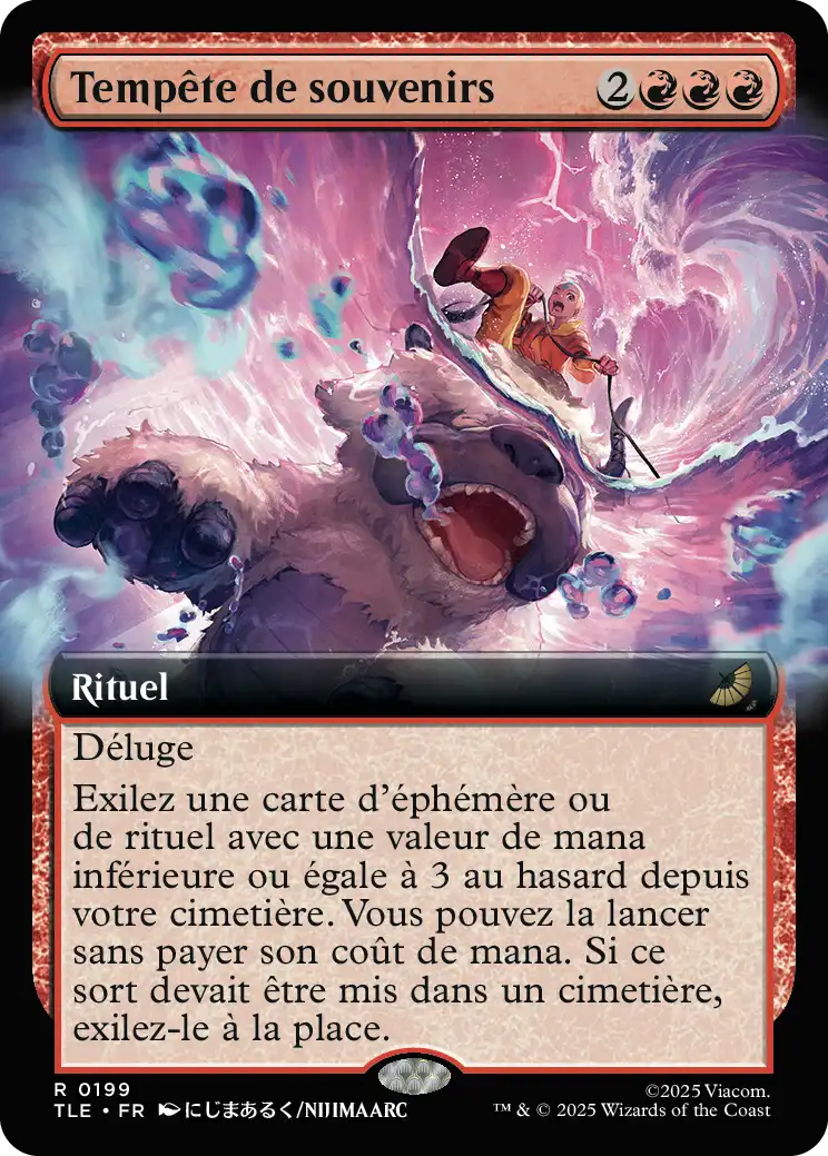 Exilez une carte d'éphémère ou de rituel avec une valeur de mana inférieure ou égale à 3 au hasard depuis votre cimetière. Vous pouvez la lancer sans payer son coût de mana. Si ce sort devait être mis dans un cimetière, exilez-le à la place.