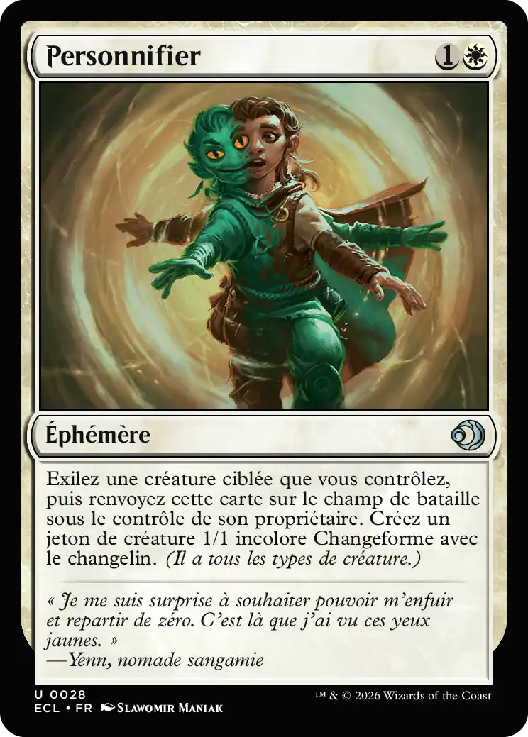Exilez une créature ciblée que vous contrôlez, puis renvoyez cette carte sur le champ de bataille sous le contrôle de son propriétaire. Créez un jeton de créature 1/1 incolore Changeforme avec le changelin.