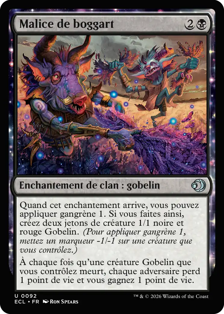 Quand cet enchantement arrive, vous pouvez appliquer gangrène . Si vous faites ainsi, créez deux jetons de créature 1/1 noire et rouge Gobelin.