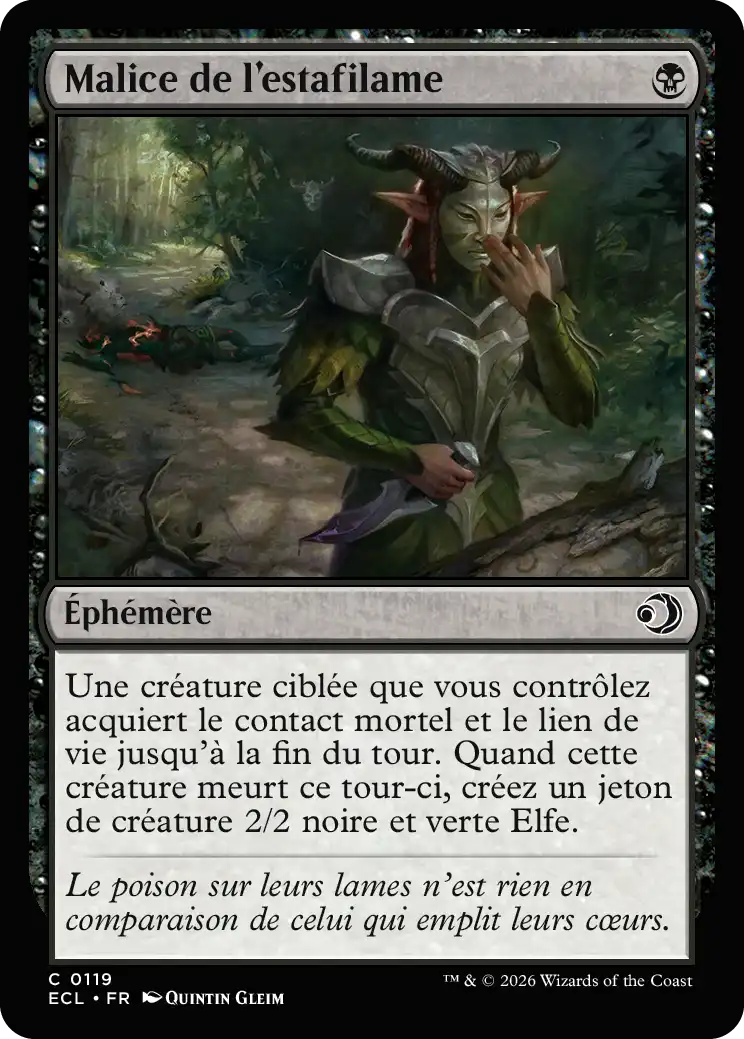 Une créature ciblée que vous contrôlez acquiert le contact mortel et le lien de vie jusqu'à la fin du tour. Quand cette créature meurt ce tour-ci, créez un jeton de créature 2/2 noire et verte Elfe.