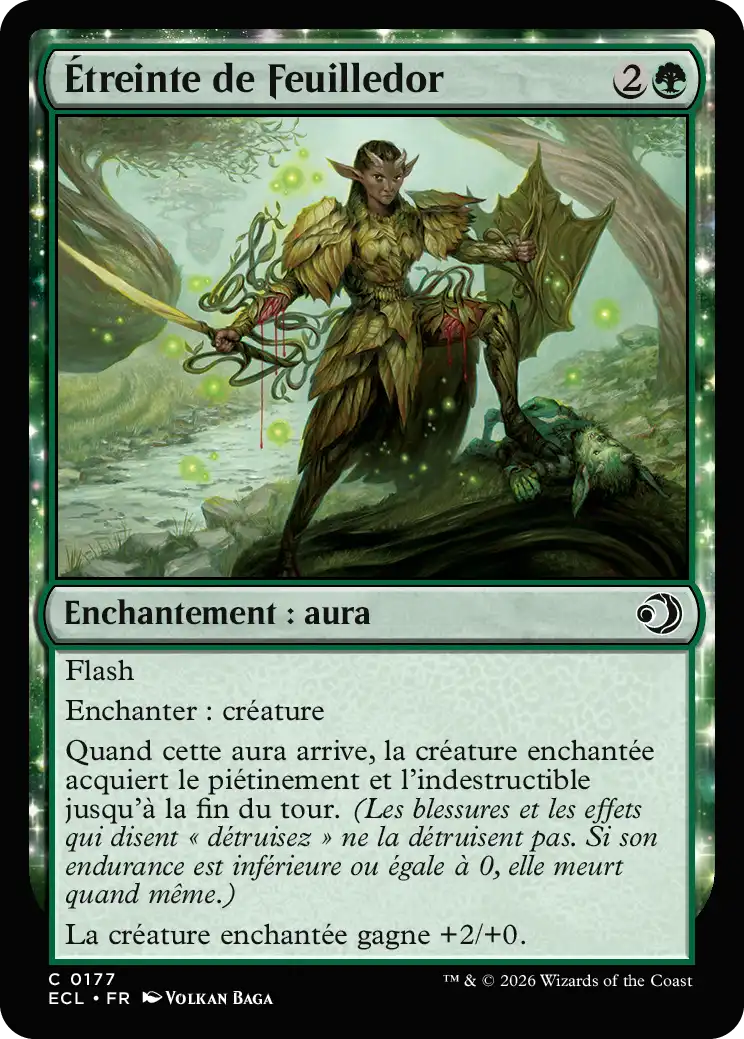 Quand cette aura arrive, la créature enchantée acquiert le piétinement et l'indestructible jusqu'à la fin du tour.