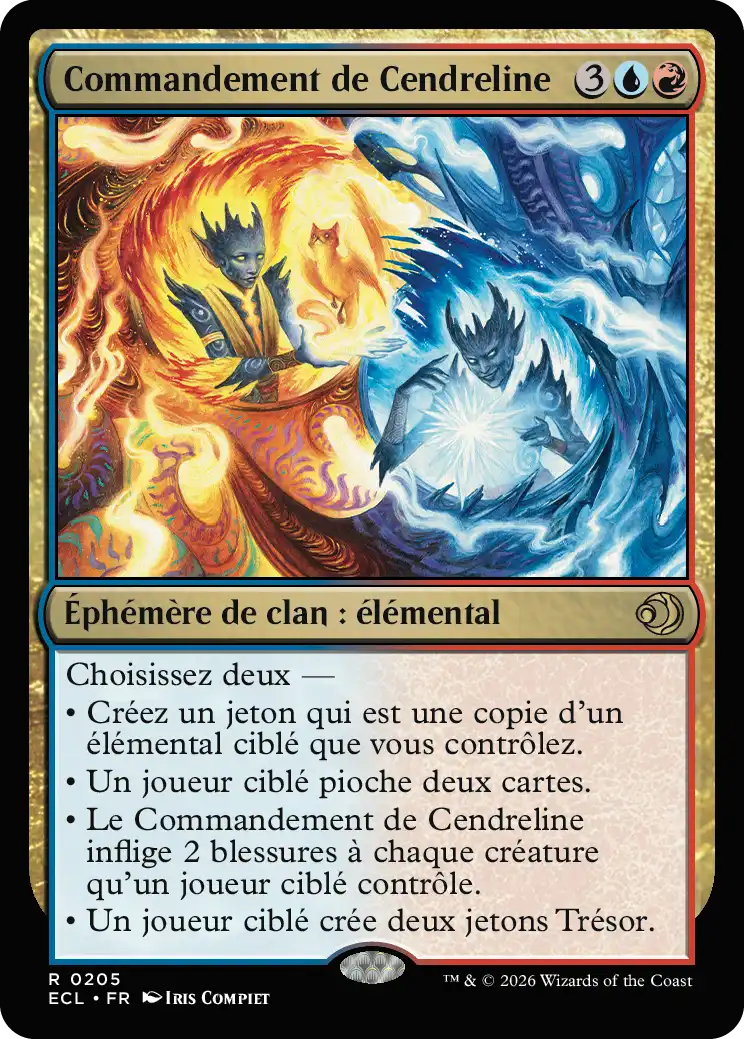• Le Commandement de Cendreline inflige 2 blessures à chaque créature qu'un joueur ciblé contrôle.