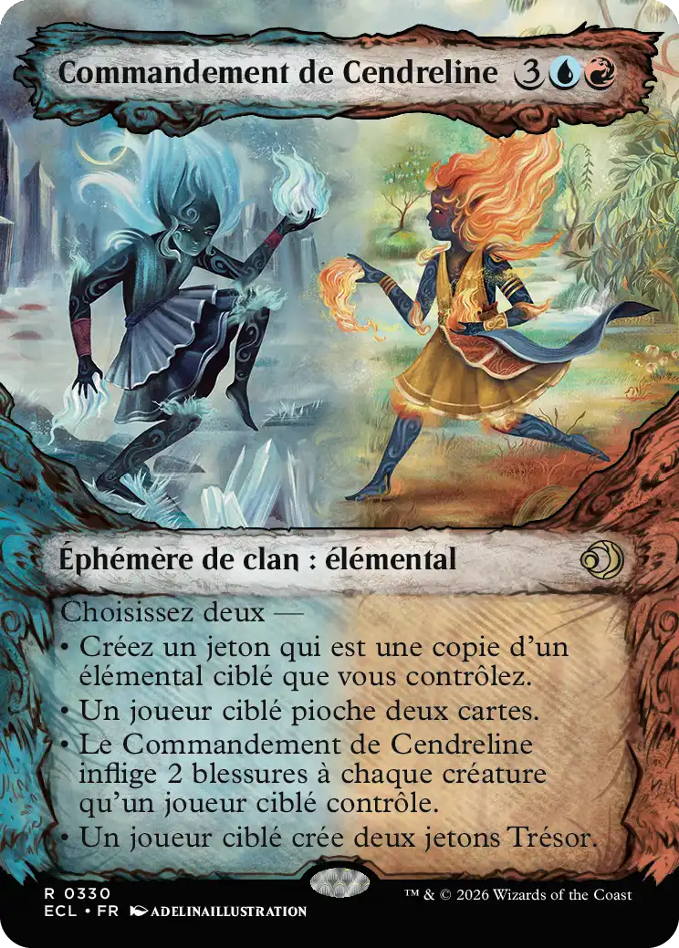 • Le Commandement de Cendreline inflige 2 blessures à chaque créature qu'un joueur ciblé contrôle.