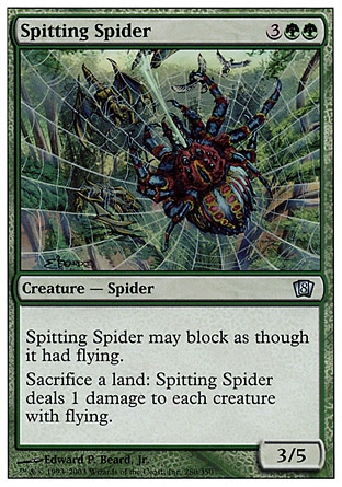 Sacrifice a land: Spitting Spider deals 1 damage to each creature with flying.