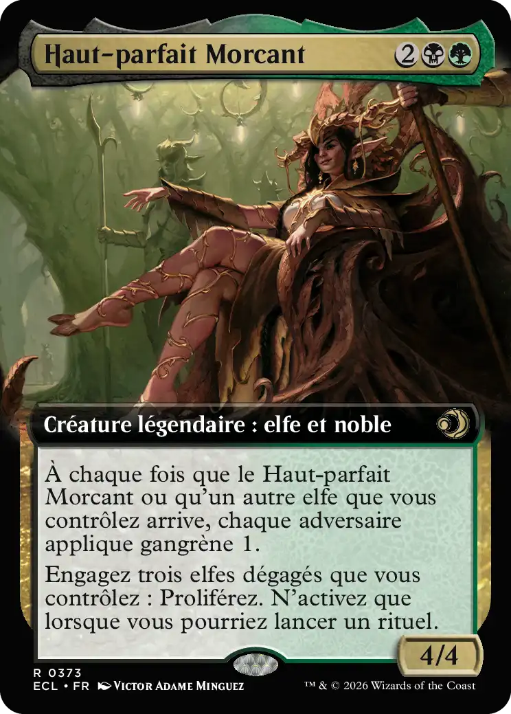 À chaque fois que le Haut-parfait Morcant ou qu'un autre elfe que vous contrôlez arrive, chaque adversaire applique gangrène