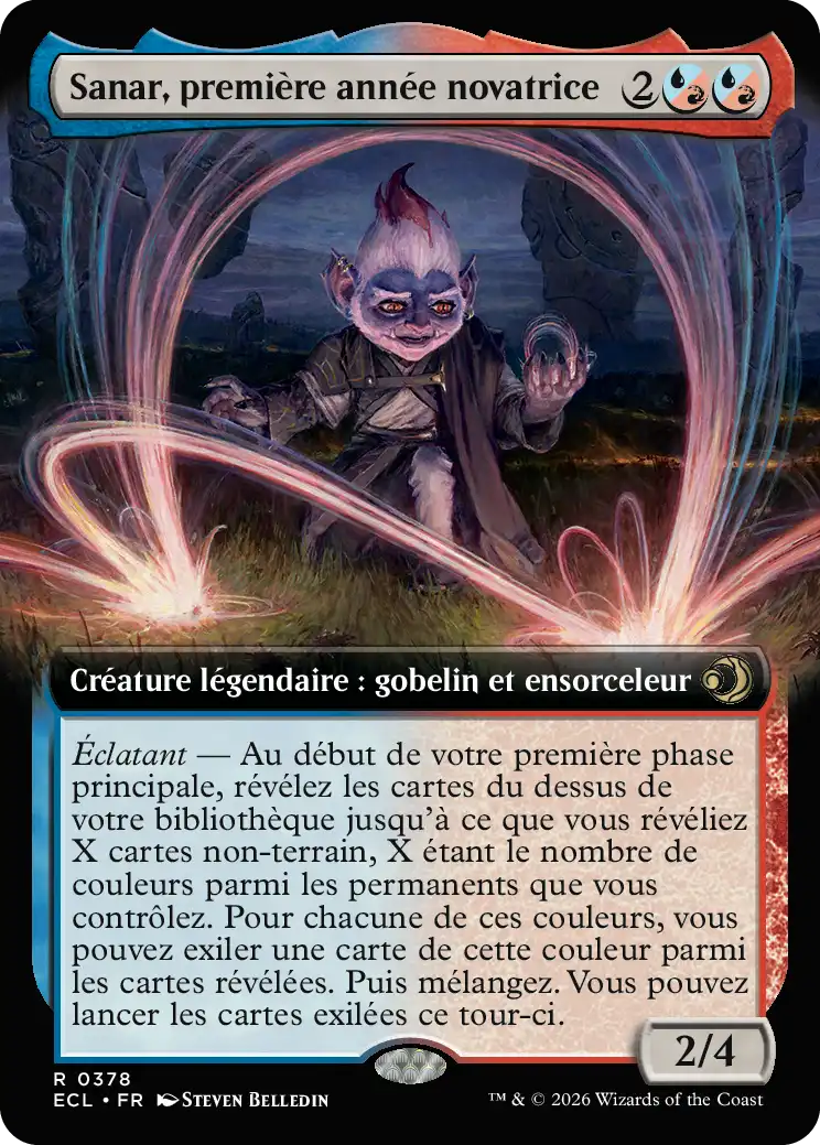 Éclatant — Au début de votre première phase principale, révélez les cartes du dessus de votre bibliothèque jusqu'à ce que vous révéliez X cartes non-terrain, X étant le nombre de couleurs parmi les permanents que vous contrôlez. Pour chacune de ces couleurs, vous pouvez exiler une carte de cette couleur parmi les cartes révélées. Puis mélangez. Vous pouvez lancer les cartes exilées ce tour-ci.
