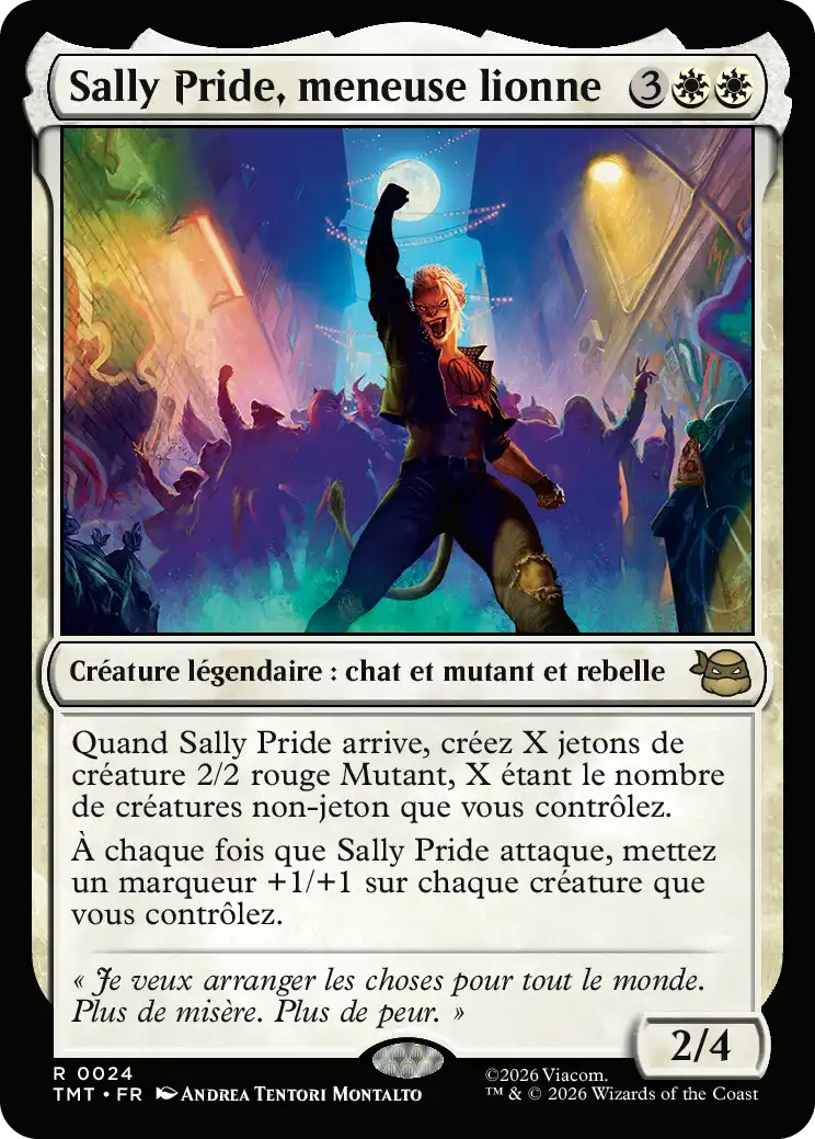 Quand Sally Pride arrive, créez X jetons de créature 2/2 rouge Mutant, X étant le nombre de créatures non-jeton que vous contrôlez.