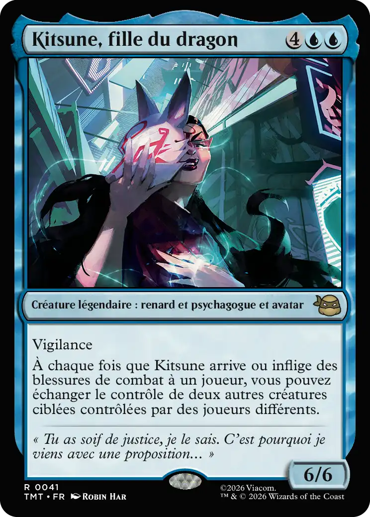 À chaque fois que Kitsune arrive ou inflige des blessures de combat à un joueur, vous pouvez échanger le contrôle de deux autres créatures ciblées contrôlées par des joueurs différents.