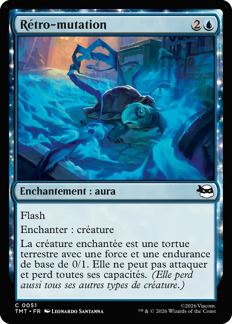 La créature enchantée est une tortue terrestre avec une force et une endurance de base de 0/1. Elle ne peut pas attaquer et perd toutes ses capacités. (Elle perd aussi tous ses autres types de créature.).