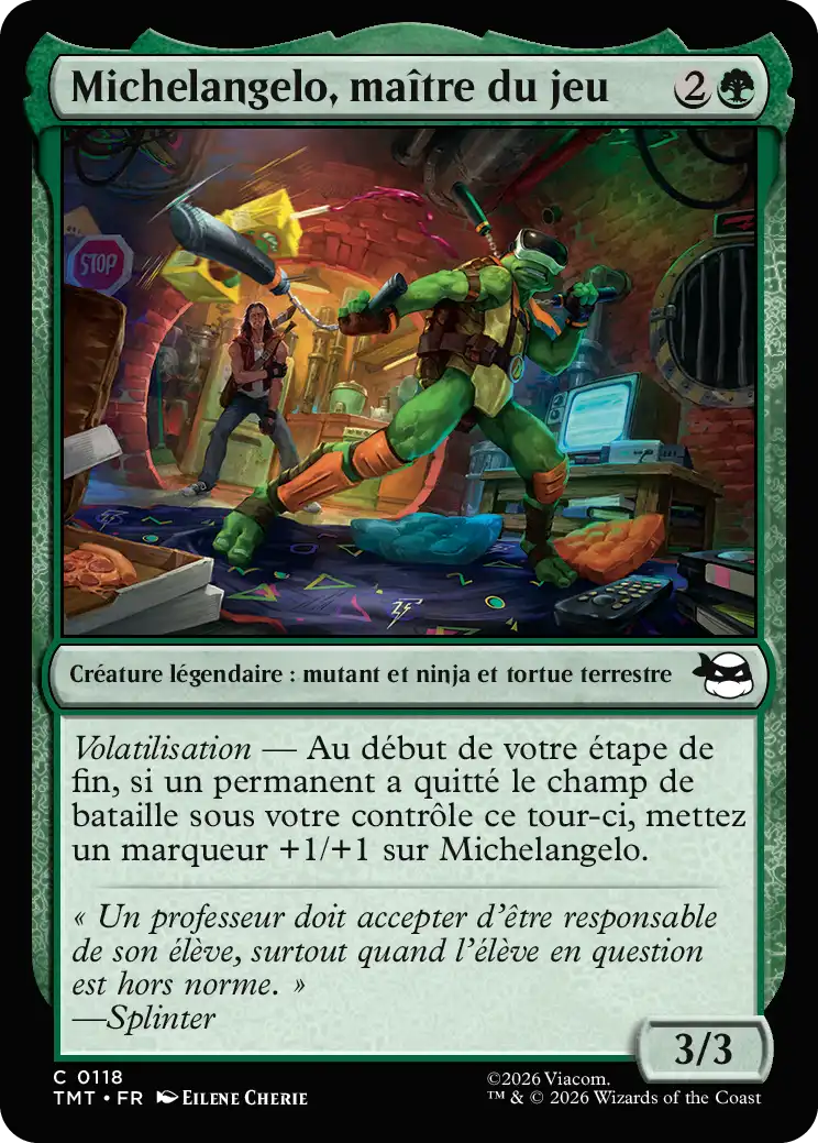 À chaque fois que Michelangelo inflige des blessures de combat à un joueur, vous pouvez mettre sur le champ de bataille une carte de créature et/ou une carte de terrain de votre main.