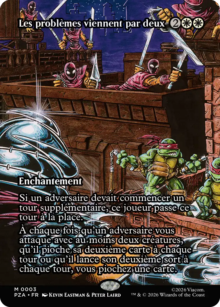 À chaque fois qu'un adversaire vous attaque avec au moins deux créatures, qu'il pioche sa deuxième carte à chaque tour ou qu'il lance son deuxième sort à chaque tour, vous piochez une carte.