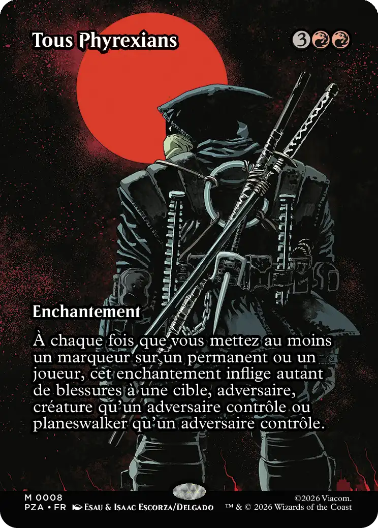 À chaque fois que vous mettez au moins un marqueur sur un permanent ou un joueur, cet enchantement inflige autant de blessures à une cible, adversaire, créature qu'un adversaire contrôle ou planeswalker qu'un adversaire contrôle.