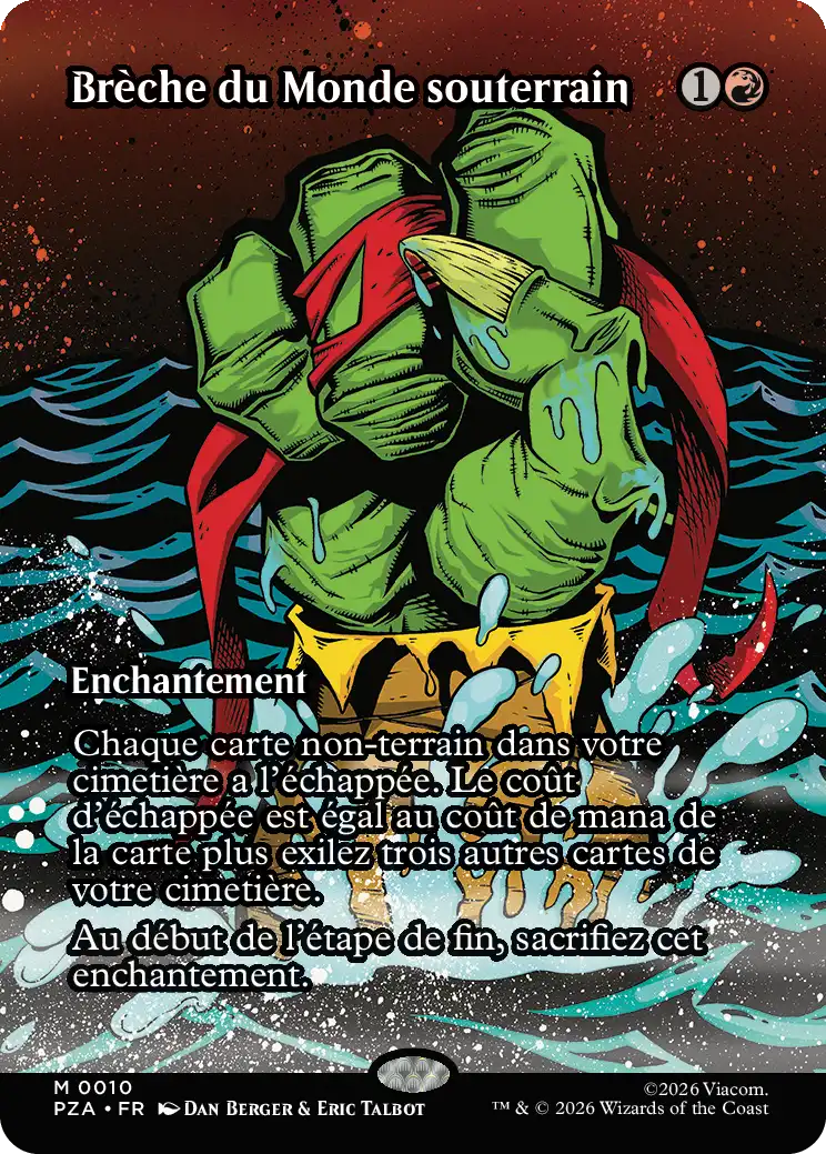 Chaque carte non-terrain dans votre cimetière a l'échappée. Le coût d'échappée est égal au coût de mana de la carte plus l'exil de trois autres cartes de votre cimetière. (Vous pouvez lancer des cartes depuis votre cimetière pour leur cout d'échappée.)