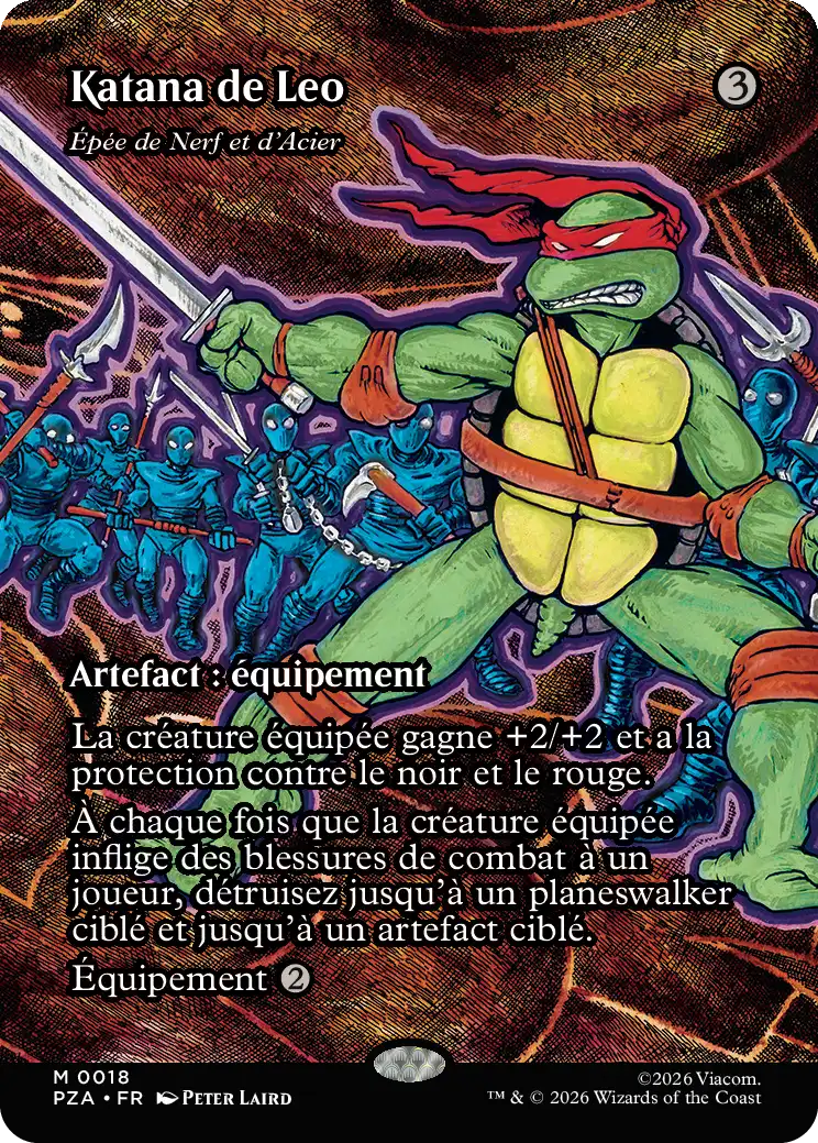 À chaque fois que la créature équipée inflige des blessures de combat à un joueur, détruisez jusqu'à un planeswalker ciblé et jusqu'à un artefact ciblé.