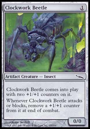 Whenever Clockwork Beetle attacks or blocks, remove a +1/+1 counter from it at end of combat.