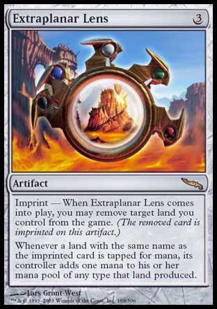 Empreinte — Quand la Lentille extraplanaire arrive sur le champ de bataille, vous pouvez exiler la carte de terrain ciblée que vous contrôlez.