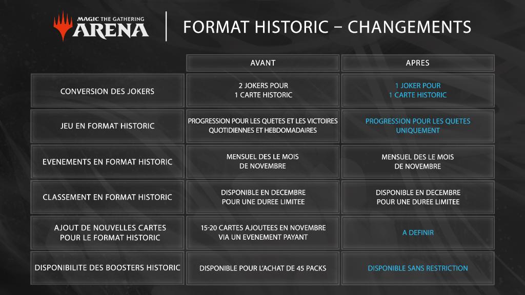 - Pas de changement au final pour obtenir des cartes via des jokers. A partir de novembre, il faudra 2 jokers de même rareté pour crafter une carte historique, contre 1 pour les sets standard. Y compris pour les cartes rééditées en standard (exemple : Liens lumineux coutera 1 Joker en Guilds of Ravnica, mais 2 en Ixalan/M19).